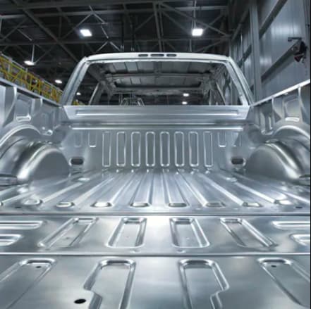 The Ford F-150 has the only high-strength, military-grade, aluminum-alloy body in its class.* A heat-treating process is used to harden the aluminum alloy. Working with aluminum alloy allows an increase in gauge (or thickness) where needed to achieve strength without increasing weight. The lighter aluminum-alloy body and bed produce a higher power-to-weight ratio - plus maximum payload and tow ratings that are best in class.* Yet another benefit - resistance to dents.